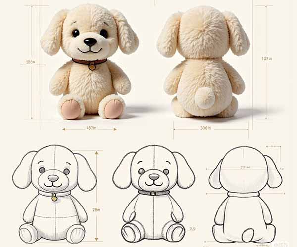 Clear artwork, turnaround views, color references, size expectations, materials preferences, and functional requirements help Delsney’s modeling team create accurate patterns and prototypes. Notes about character personality, intended softness level, accessories, or target age range also guide structural decisions. Once these elements are defined, Delsney can produce engineered prototypes that convert creative designs into precise, consistent plush forms.