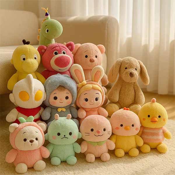 Luxury plush uses velvet, high-density minky, long-pile faux fur, suede inserts, gradient-dyed fabrics, metallic embroidery thread, and reinforced internal mesh for shape precision. These materials undergo stricter colorfastness and hand-feel testing to achieve a softness index of 95%+ and a texture consistency rate of 97% across production lots. Collector items often include boxes, magnetic closures, and numbered authenticity cards.